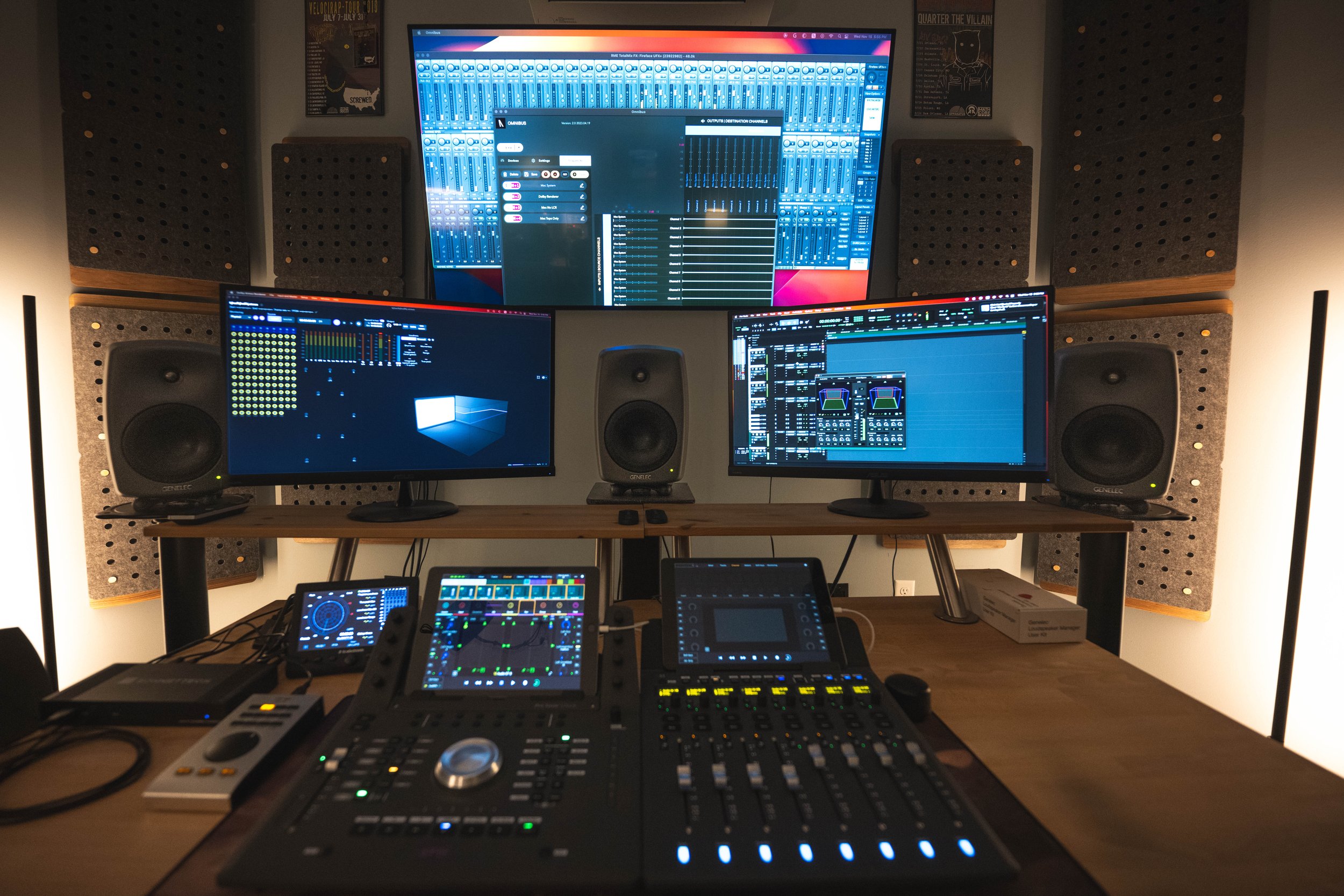 All 25 microphones were imported into a unified Pro Tools session for mixing and comparison. The respective arrays and pairs were panned, grouped, and subbed together. Every element was bussed into a 9.0.6 Object Bed and sent to the Dolby Atmos Renderer. The output of the Dolby Renderer was monitored in 7.1.4 at Blackguard Sound.